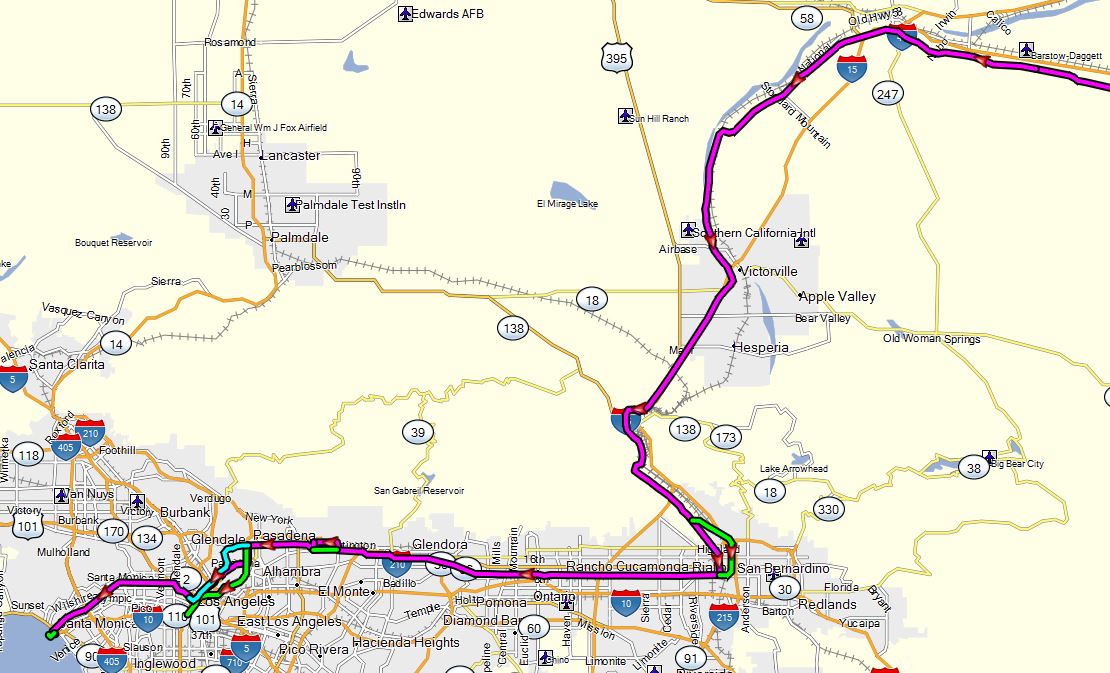 Rolling out of Barstow this morning, I was fairly sure that I could complete the Route by day’s end. Anxious thoughts about the time-consuming LA traffic ran around in my head and I knew that the speedo wasn’t going to be much in the 85 mph neighborhood today. Taking it mile by mile, the slog through the mostly residential and commercial areas ran through Old Town Victorville, Devore, Muscoy and then San Bernardino. Yet another historic alignment presented itself in SanBerdoo, consuming one of my precious hours. The Foothill Blvd. run carried me at a snail’s pace from Rancho Cucamonga to Pasadena. At that point I was faced with 3 more historic alignments, each running from Pasadena to downtown LA as my watch hit half-past 4pm. Today’s flavor of the icing on the cake, was a Dodger home game.