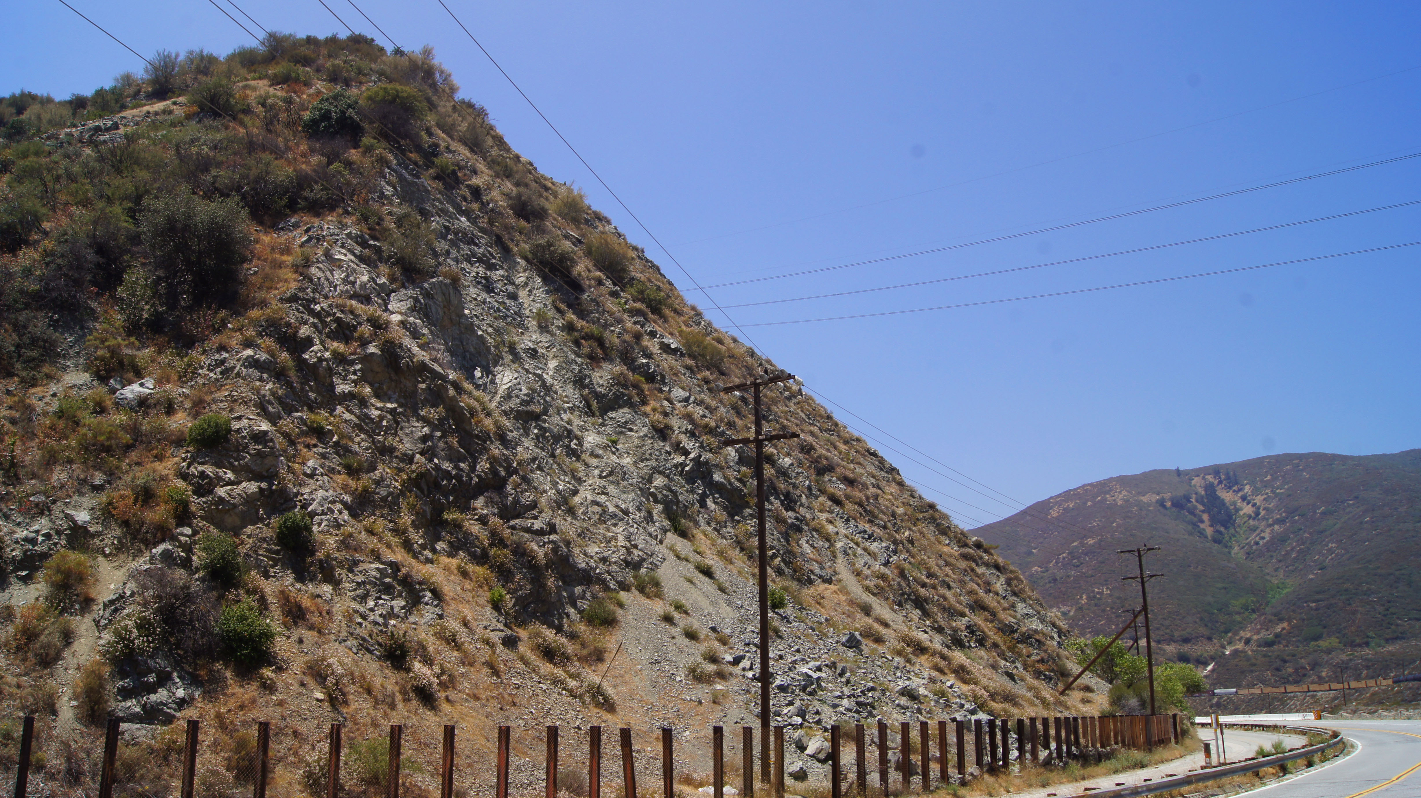 The Blue Cut – Cajon Pass This unstable hillside of bluestone is the reason why I15 was not built directly over the old alignment of RT66 in this area. (CA1)