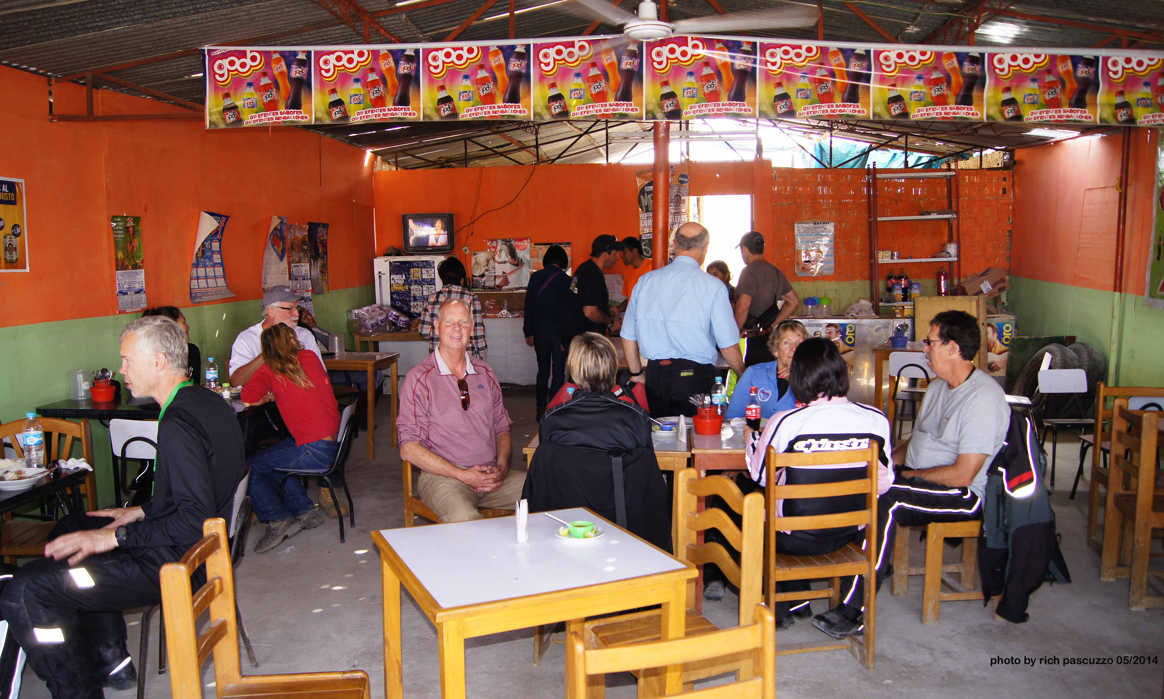 Sunday night in Moquegua is lively. The street markets rock all sorts of merchandise and foods. Cooked foods are offered on many corners and the piles of noodles, rice, chicken, breads, vegetables and fruits were tempting. They’ll even wipe off a used plate and fork on their aprons, just for you. Some of our troupe ate in the markets, but a few of us were off in pursuit of a recommendation. Sadly, it was closed due to lack of a chef. On down the line, we found the McDisco. If Ronald McDonald had married Donna Summer, this restaurant would have been theirs. Disco balls, flashing colored lights, blaring music videos, papas fritas, hamburguesas disquised as a round slice of chicken on a McDonalds style bun and Chicha (alcoholic? beverage made from purple maize) were on offer. Maybe it wasn’t exactly what we had in mind, but the food sat well with us. Do you remember the others that decided to eat at the street market? Well for them…not so much.