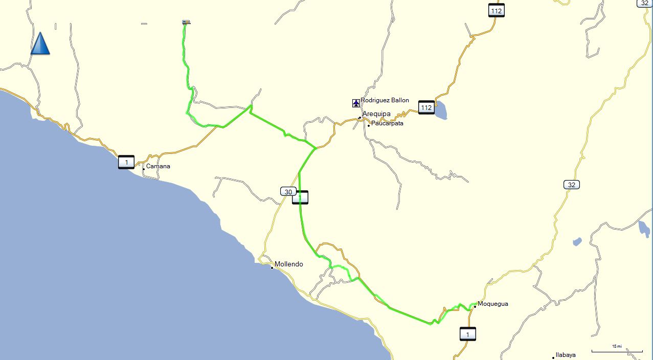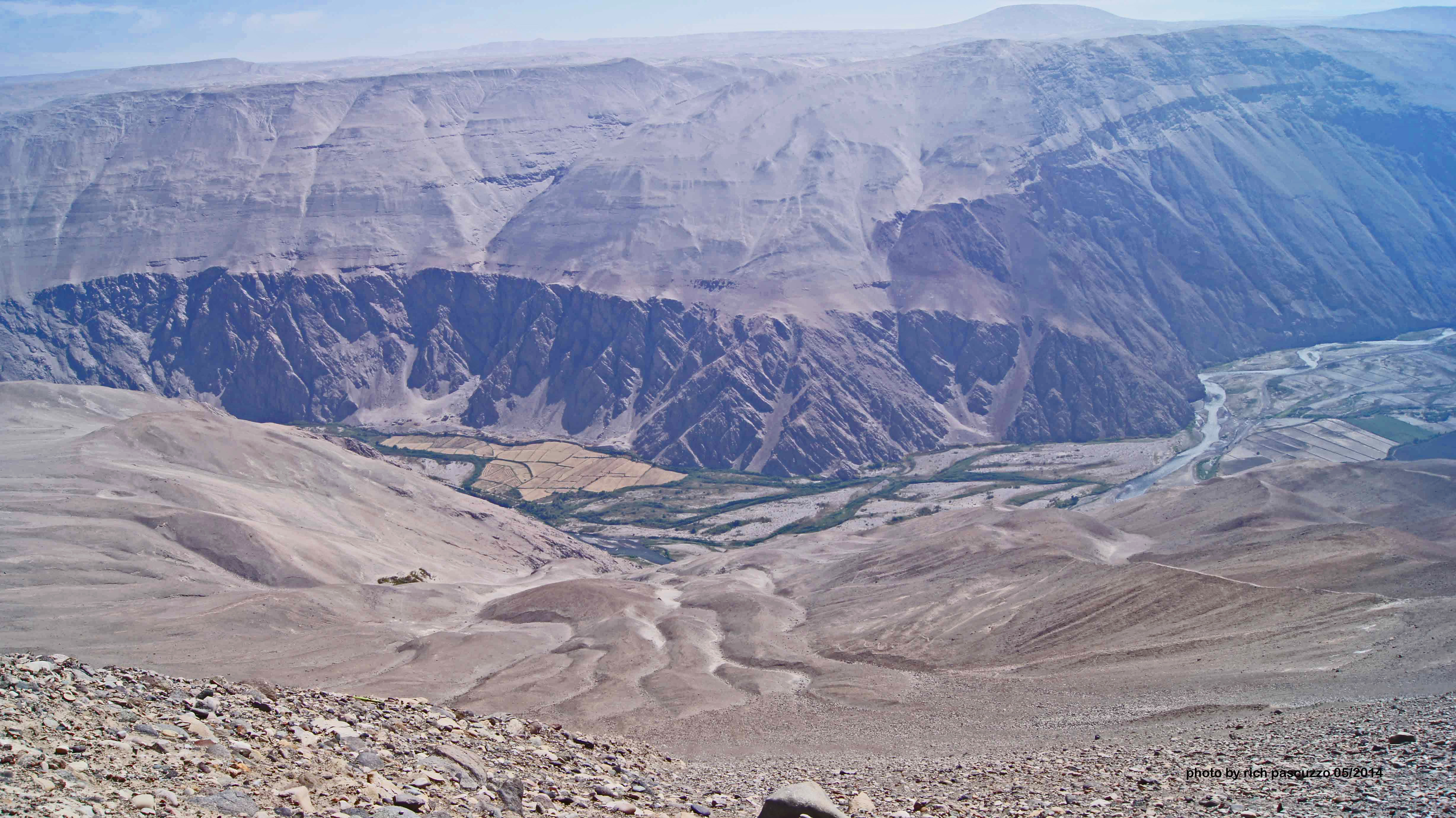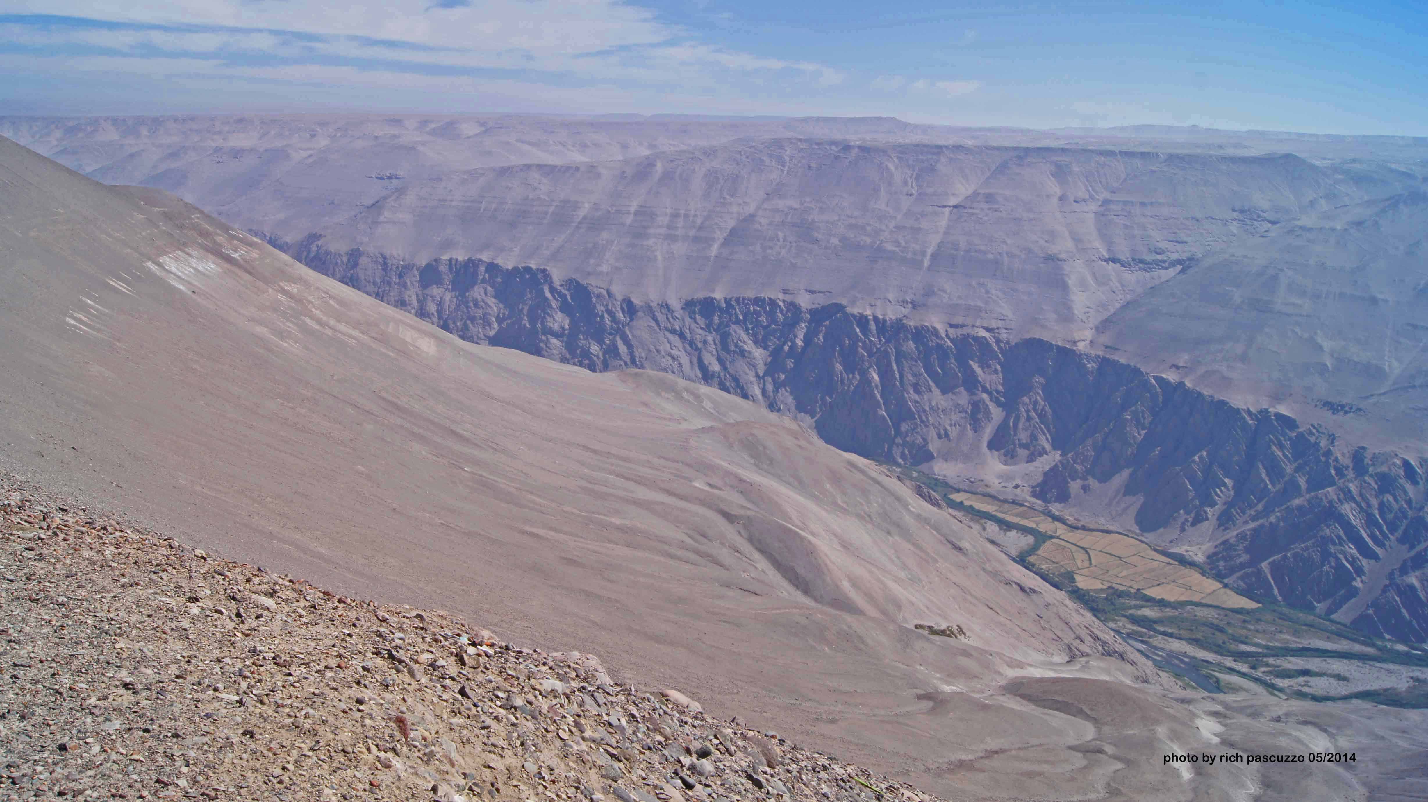 A 203 mile day lay ahead taking the group from Moquegua to La Central de Ongoro. Now, 203 miles isn’t much on a normal road, but today’s venues were anything but normal. Early-on we crossed the Rio Osmore and later the Rio Tambo. Some very deep canyons were ridden and volcanic cones surrounded us almost everywhere. The day was filled with scenic variety. We would carve our way out of one valley, up and over another Andean peak, only to begin carving our way down into the next valley. Again and again we put the chicken strips of our tires to good use. Volcan Misti at 19,100 ft. and Nevado Chachani at 19, 900 ft. oversaw our progress. Approaching the Majes Valley one last 21,100 ft. peak, Coropuna, punctured the clouds. On this desert trek, the weather was as spectacular as the scenery.