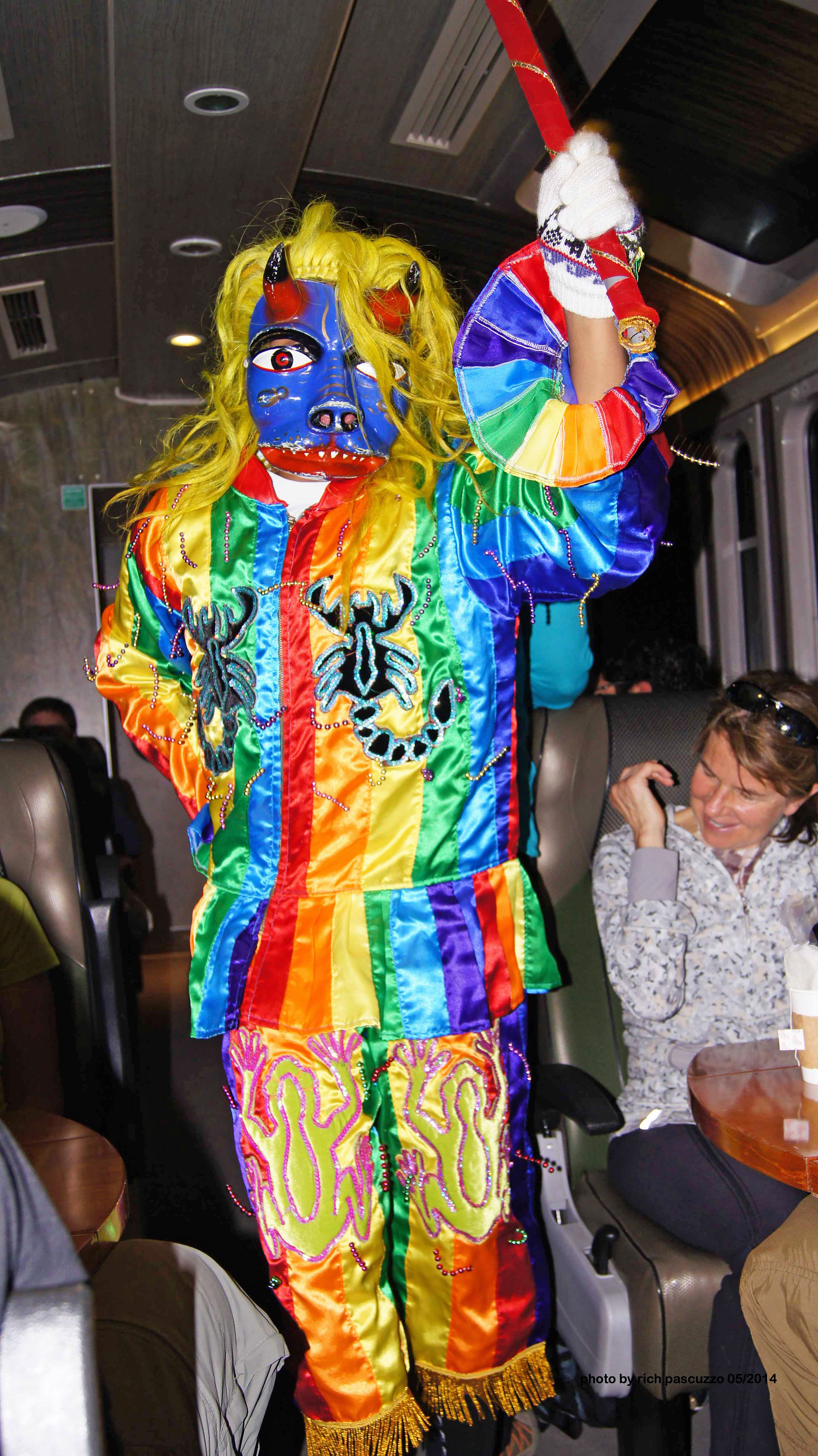 Days end brought a return train ride to Ollantaytambo, featuring a live fashion show of alpacan wool garments and even a visit from a devilish looking character who loved dancing with the ladies on the train. By now, many on this trip had taken their turn at fighting the tourist-bug. My increasing fever was an indication that I wasn’t to be spared, either.